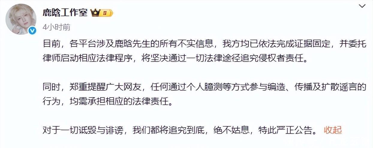 他回应时候的说法其实和鹿晗差不多,并且他们都声称要通过法律维护自己的权益。但是已经过去好几天了,还没有见到有哪位涉事明星起诉这个司女士。